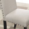 HIGHLIGHTS: The dining table features a metallic hairpin design, which adds both stability and style. It has a rustic dark pine finish and showcases a natural wood grain texture, offering an elegant look. The chairs feature fabric upholstery with brass nailheads, adding texture and visual appeal.
