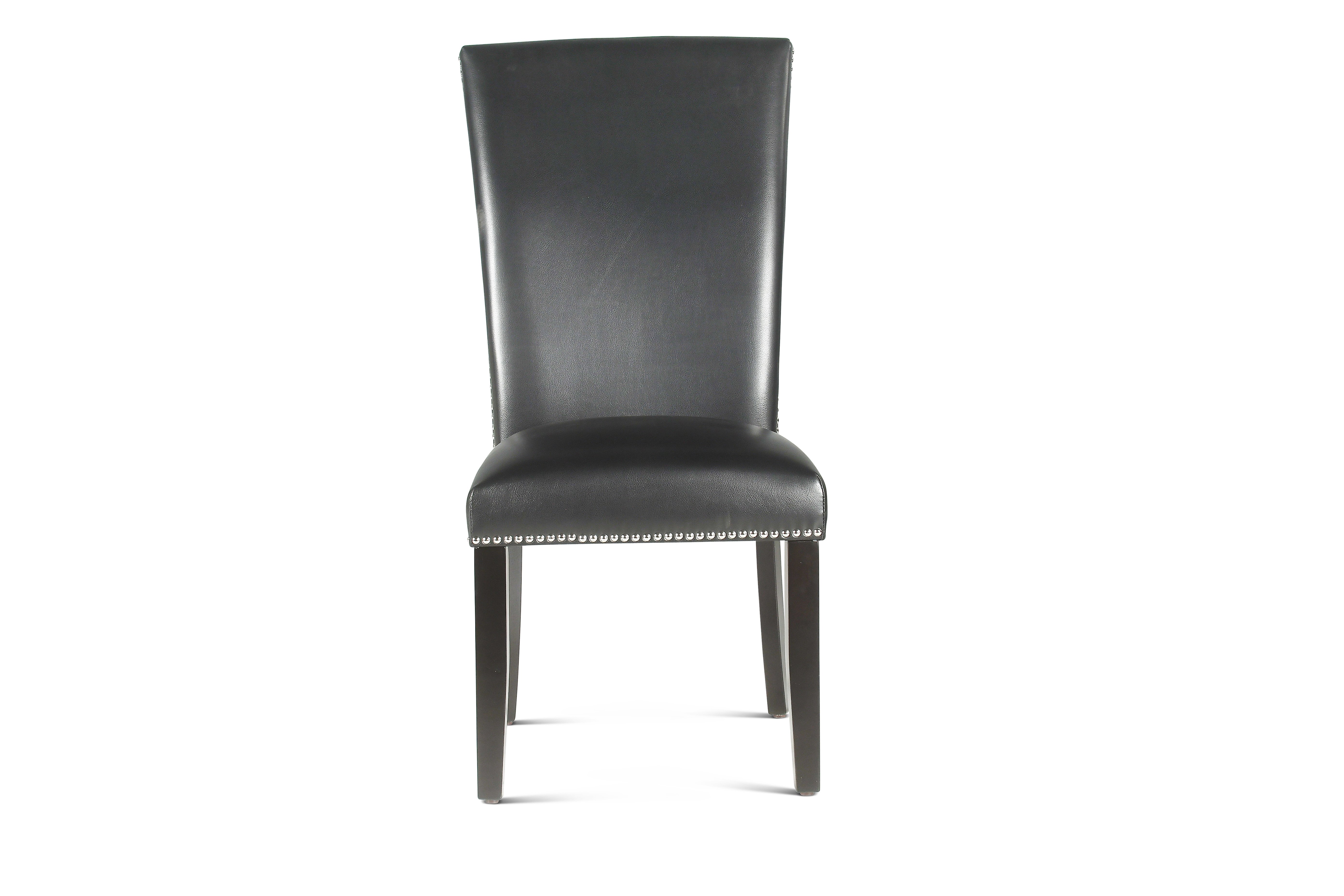 Styling details include one-piece seamless marble veneer top, "v" shaped pedestal base and easy-care black polyurethane chairs with pewter nailhead trim