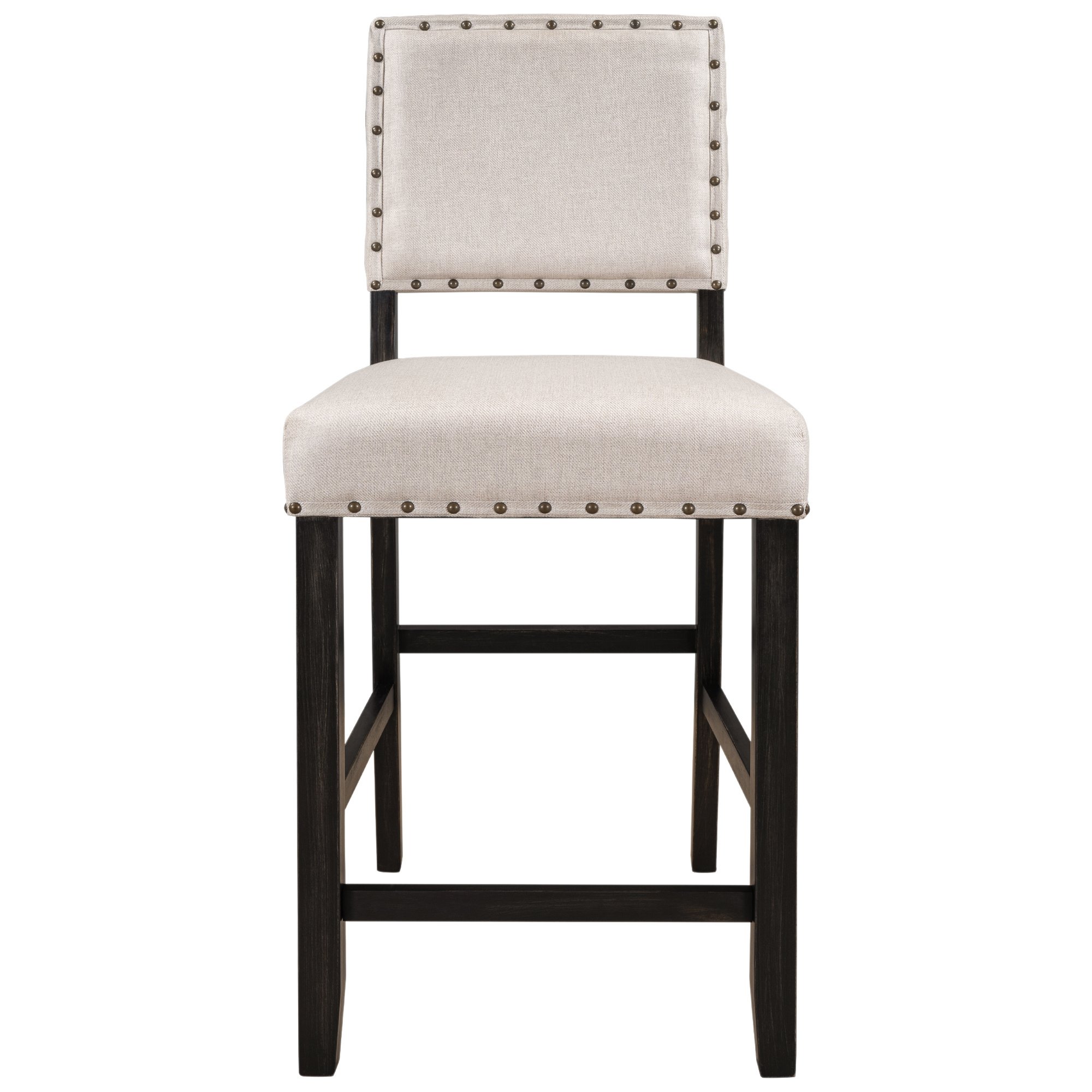 [Rustic Small Places Design] Come with 2 chairs, this graceful counter height dining chair is designed for small places. All of the chairs can be stacked under stardard table when not in use to save space. Featuring with rustic espresso coating and beige cushions as well as bronze decorated nails, this kitchen chairs will bring a bold but soft presence to any dining room.