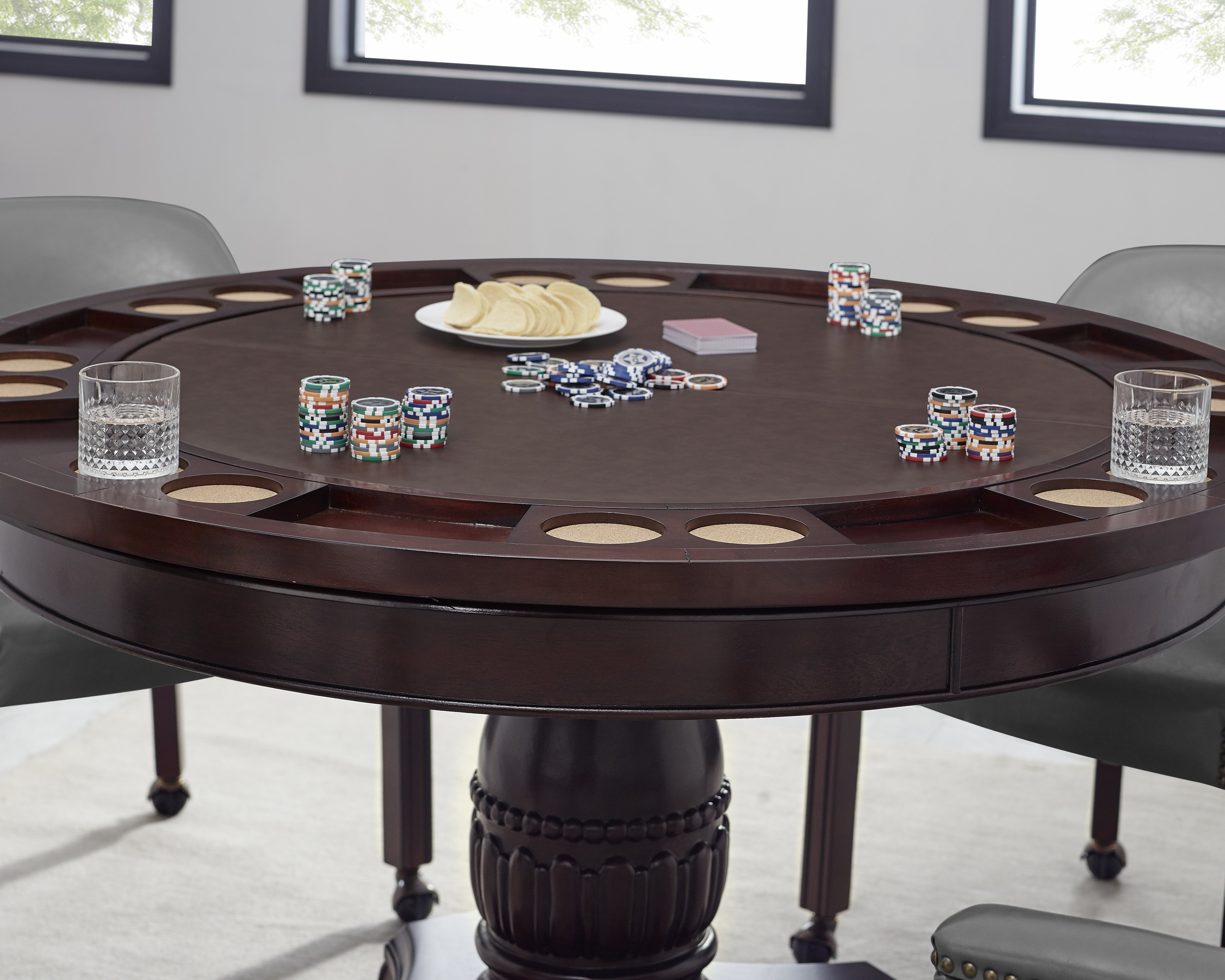 Folding game top with drink and chip holders and a faux-leather playing surface shown in brow